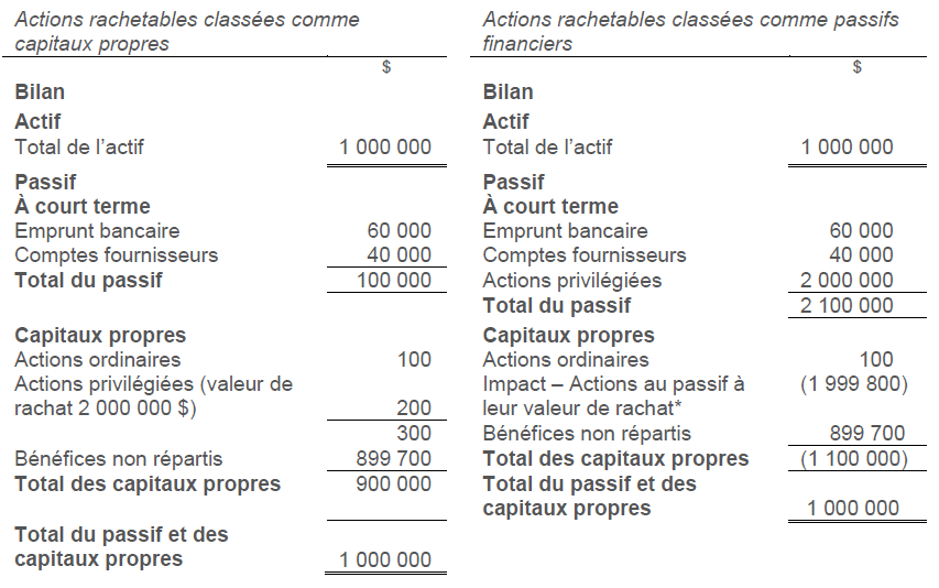 Voici des extraits d’un bilan afin d’illustrer l’incidence potentielle du classement d’actions rachetables comme capitaux propres ou comme passifs financiers.